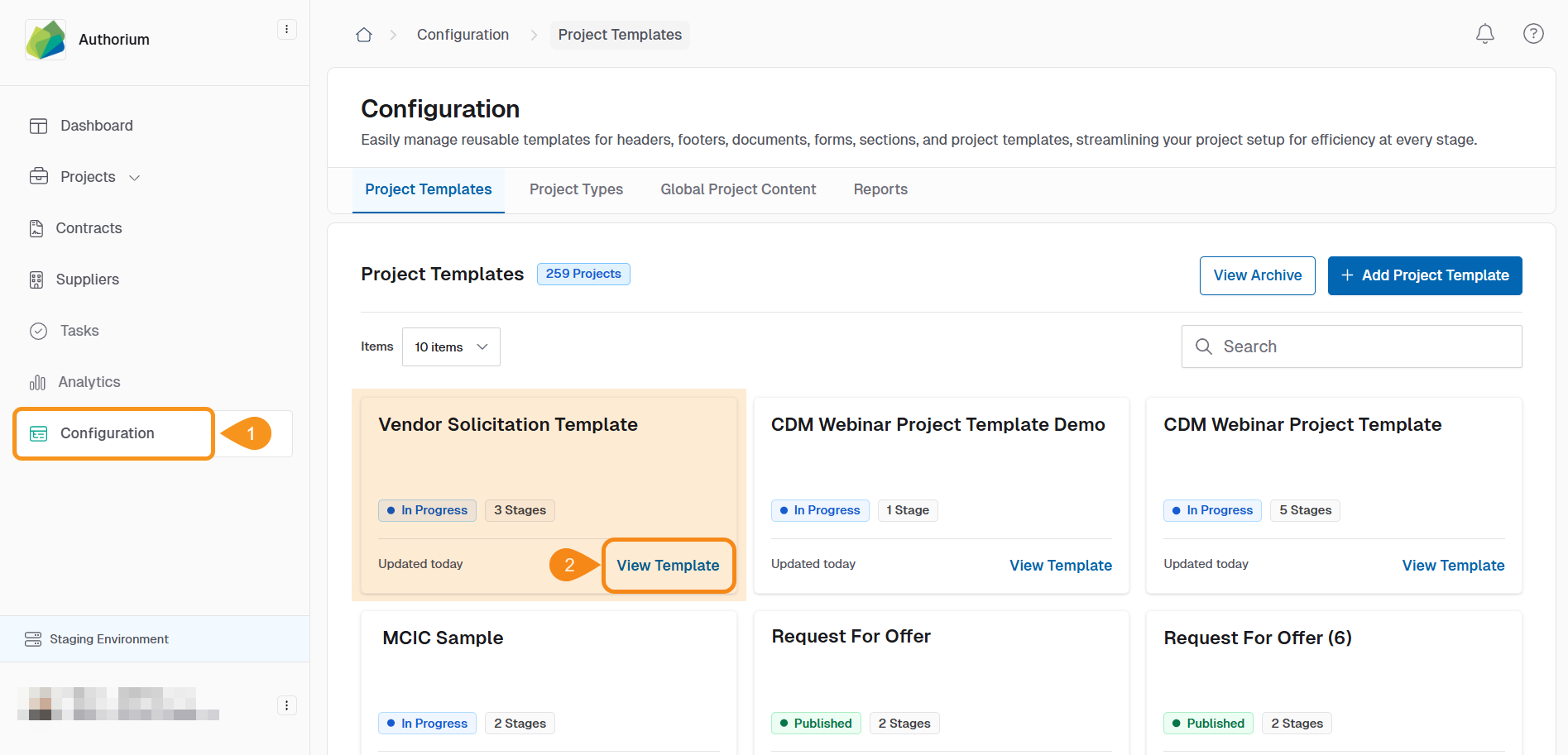 - Within the Project Templates tab, click View Template in the bottom right corner of the Project Template card to which you will add the Stage. This leads to the page where previous form builder stages and other configurations might already exist.