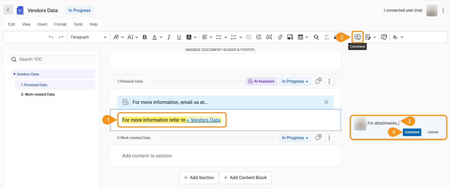 - Click into the content area under the relevant section header where you want to comment and highlight the text you want to comment on.