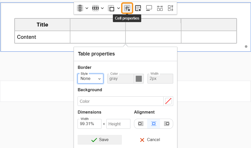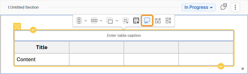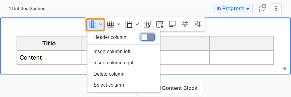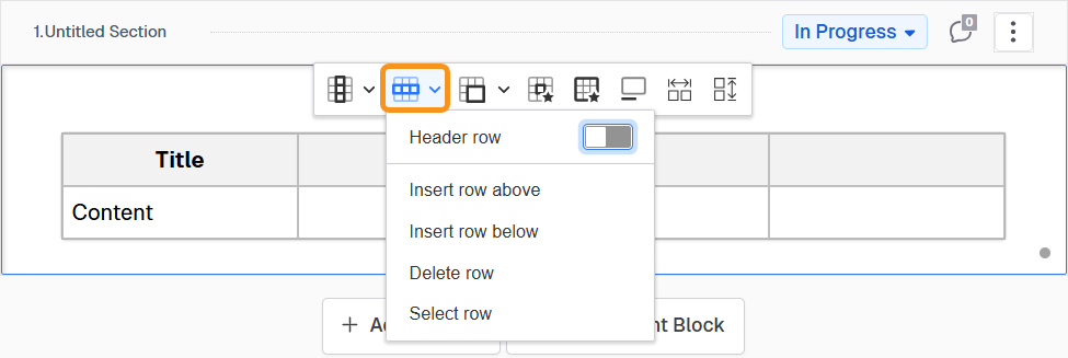 Once you insert a table, you can configure it using the table toolbar. Each button may perform an immediate action or open additional menu options for advanced editing: