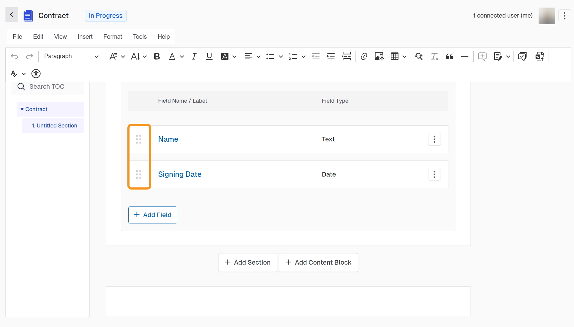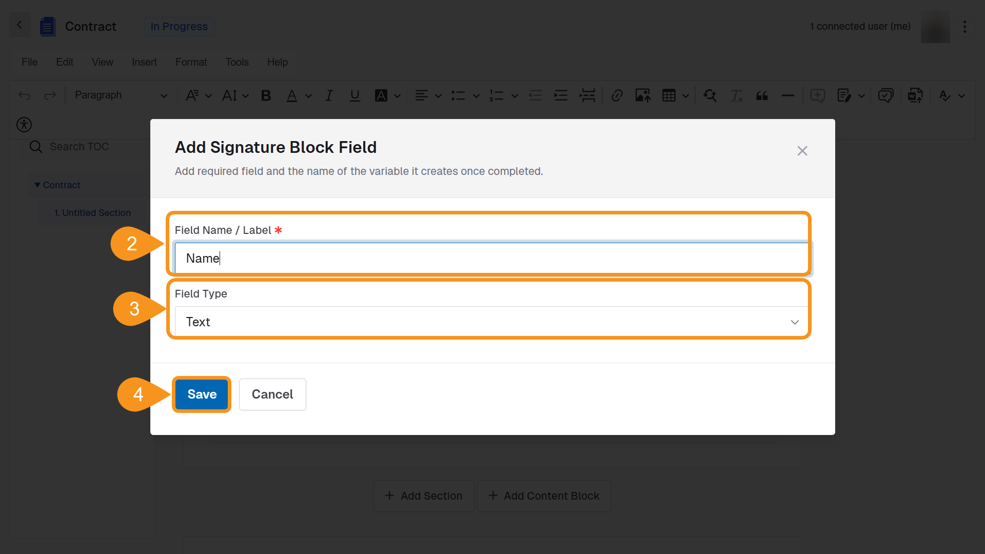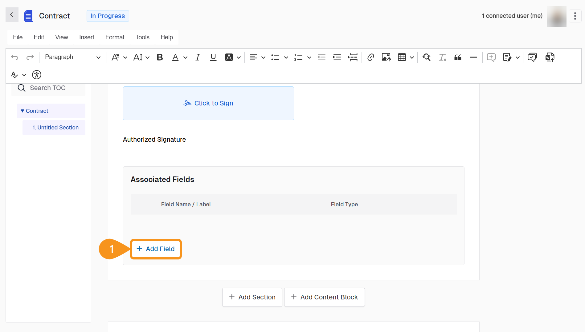 It’s recommended to add two associated fields: one for the signee’s name and one for the signing date.