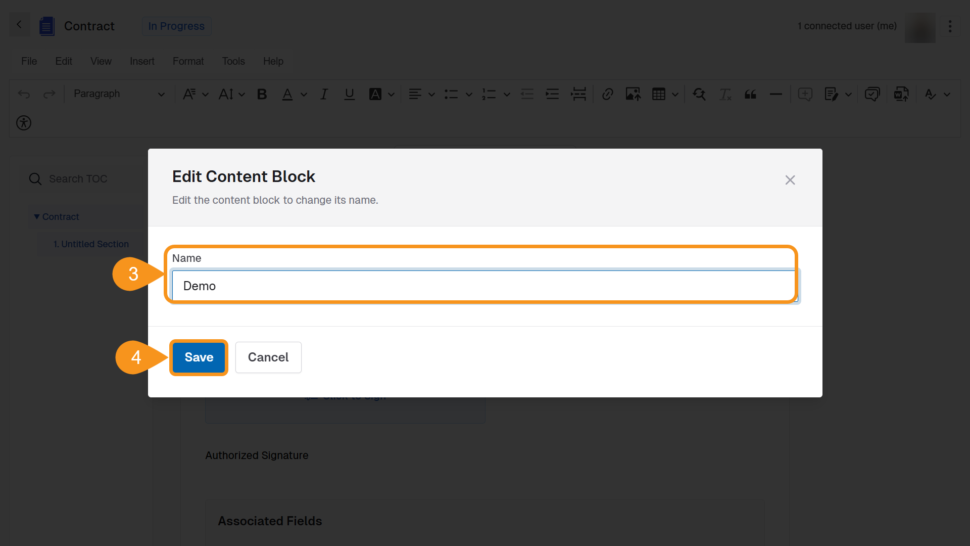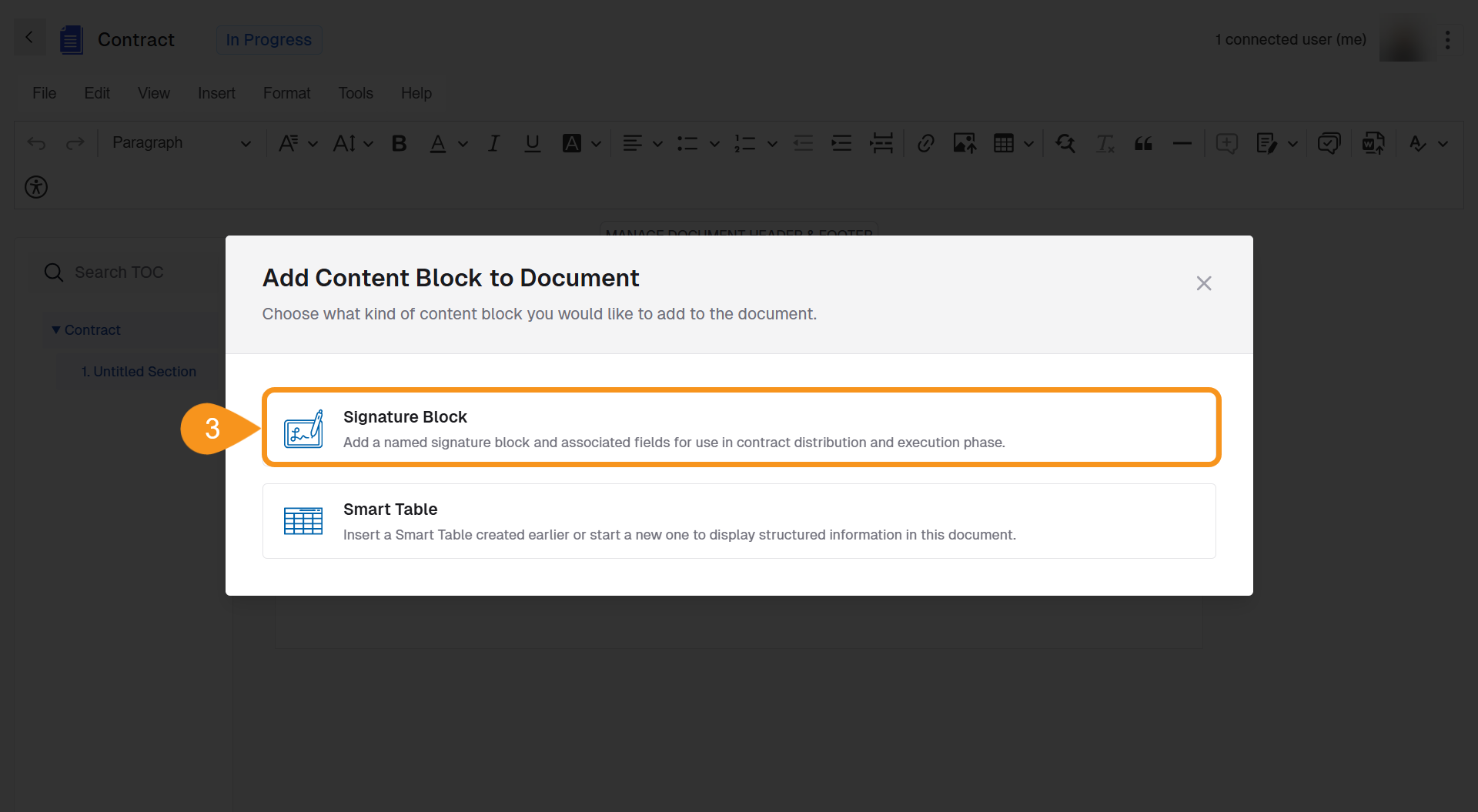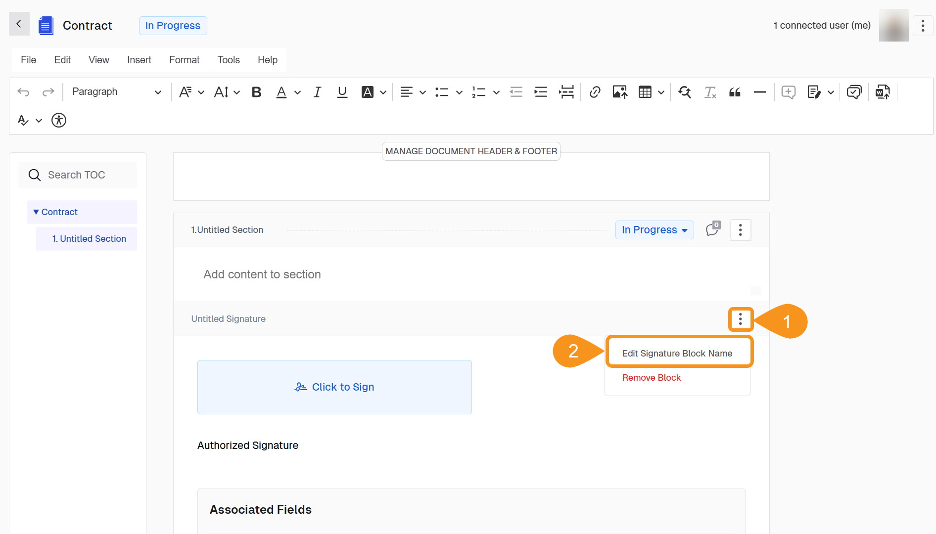 Signature blocks can be added to collaborative documents or PDF forms, and only during an active CD&E stage.