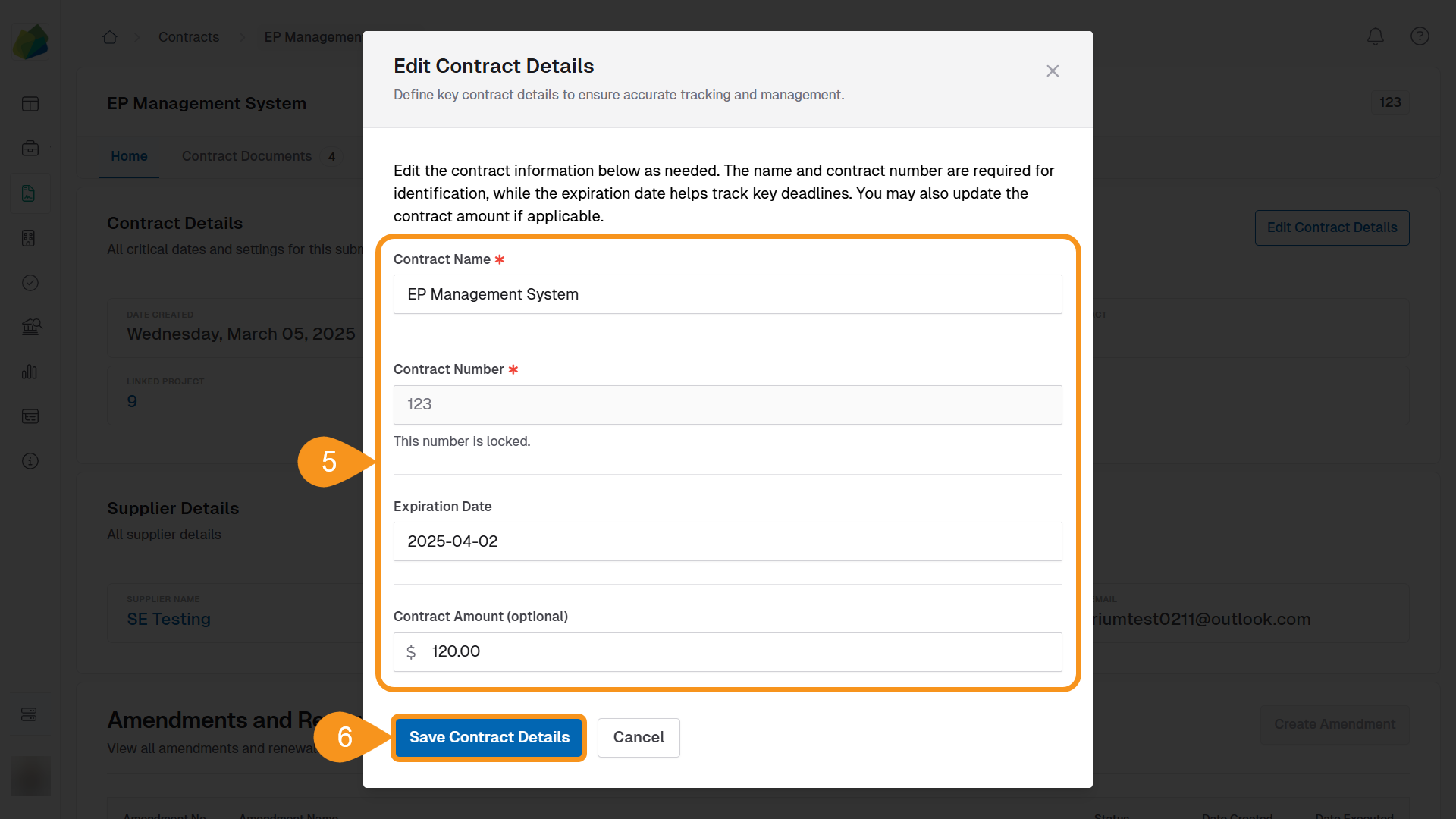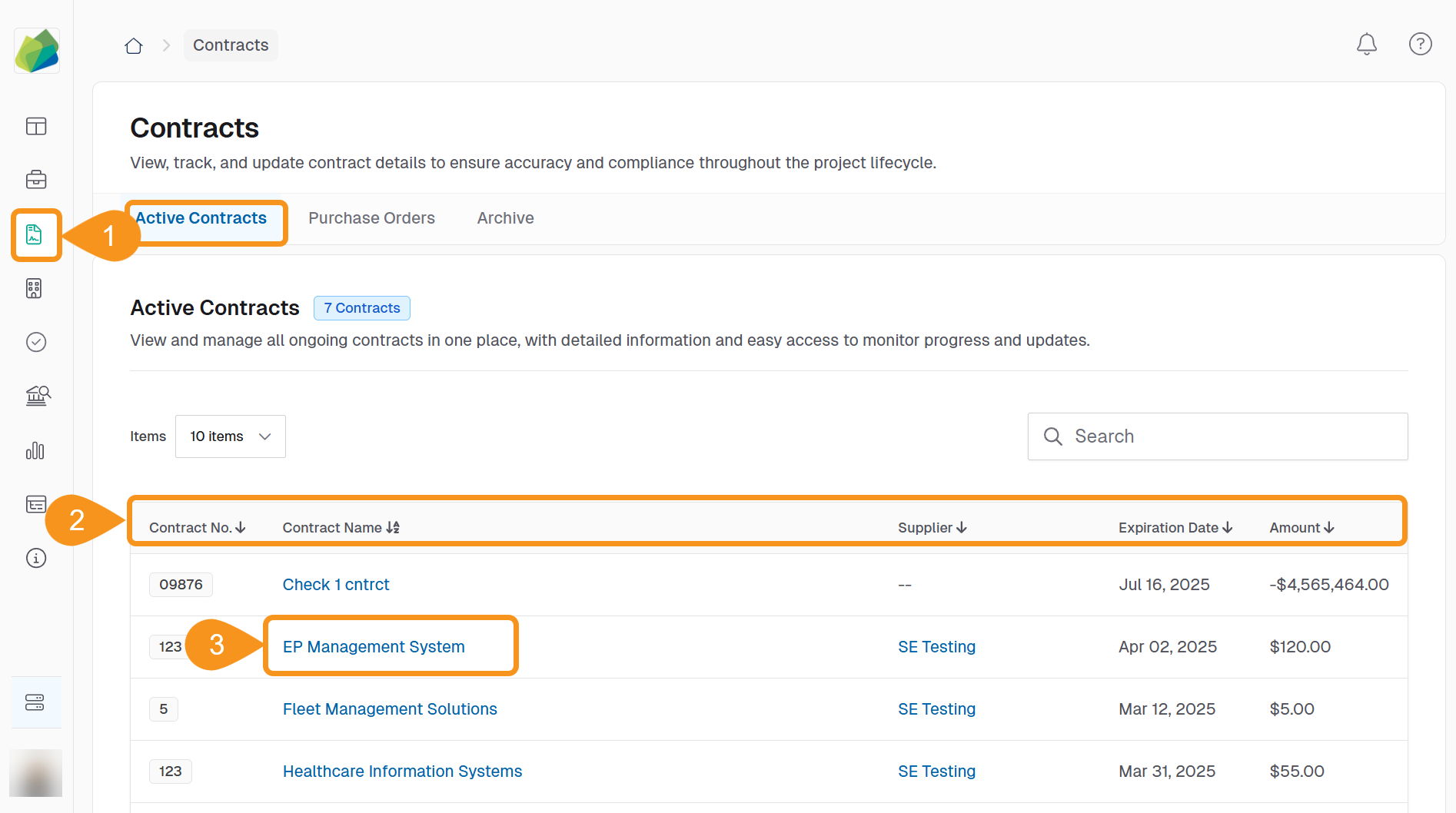 - Under Active Contracts, locate the contract you want to update. You can use the contract name, supplier, expiration date, or amount to help identify it.