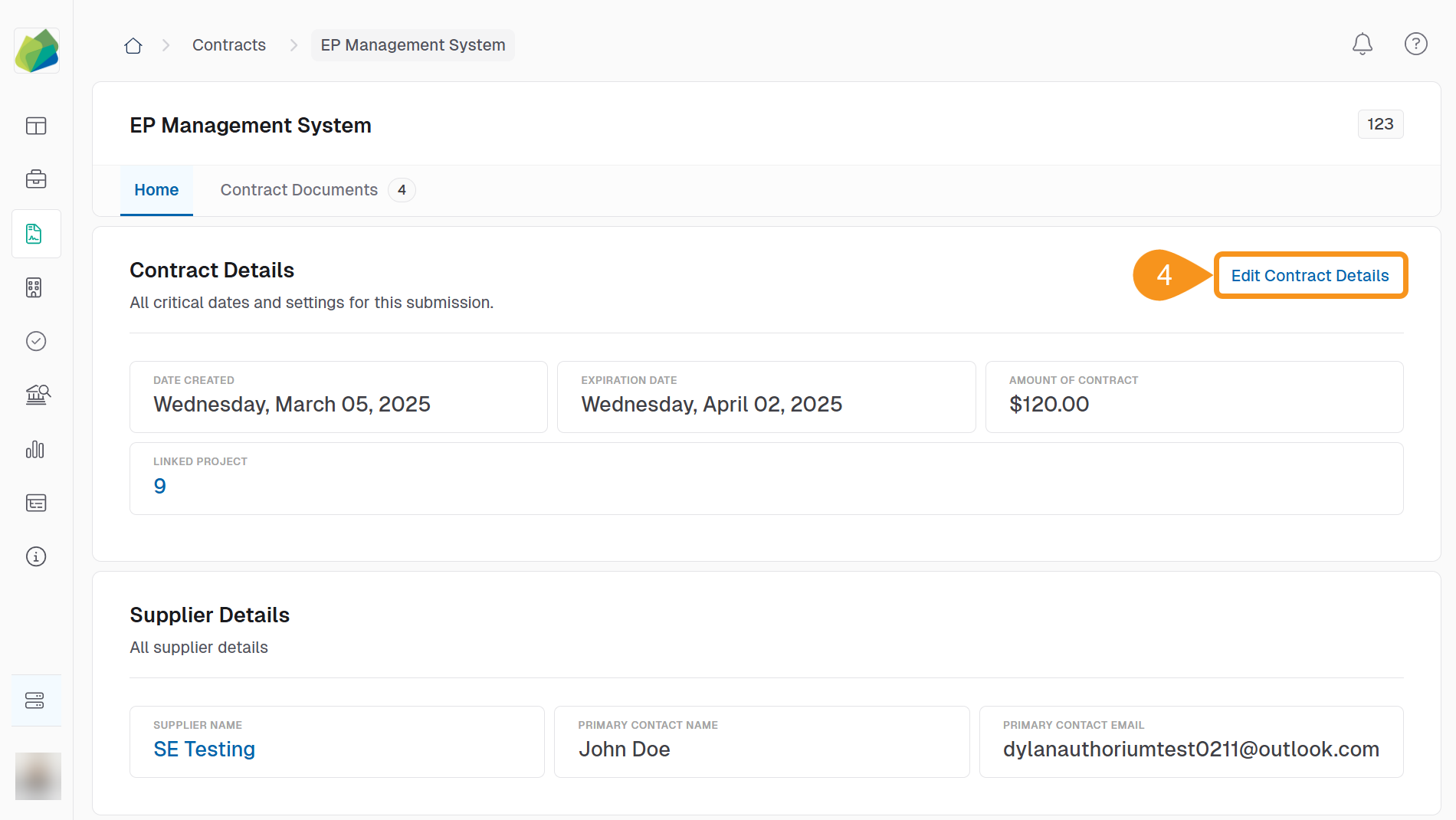 The Contract Details page also includes supplier contact info, executed documents, and the full contract document package.