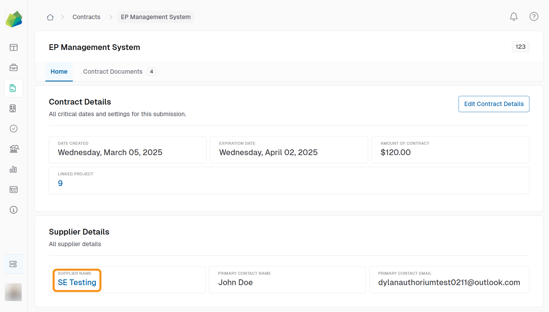 To view supplier details, click the supplier’s name from the Active Contracts list.
