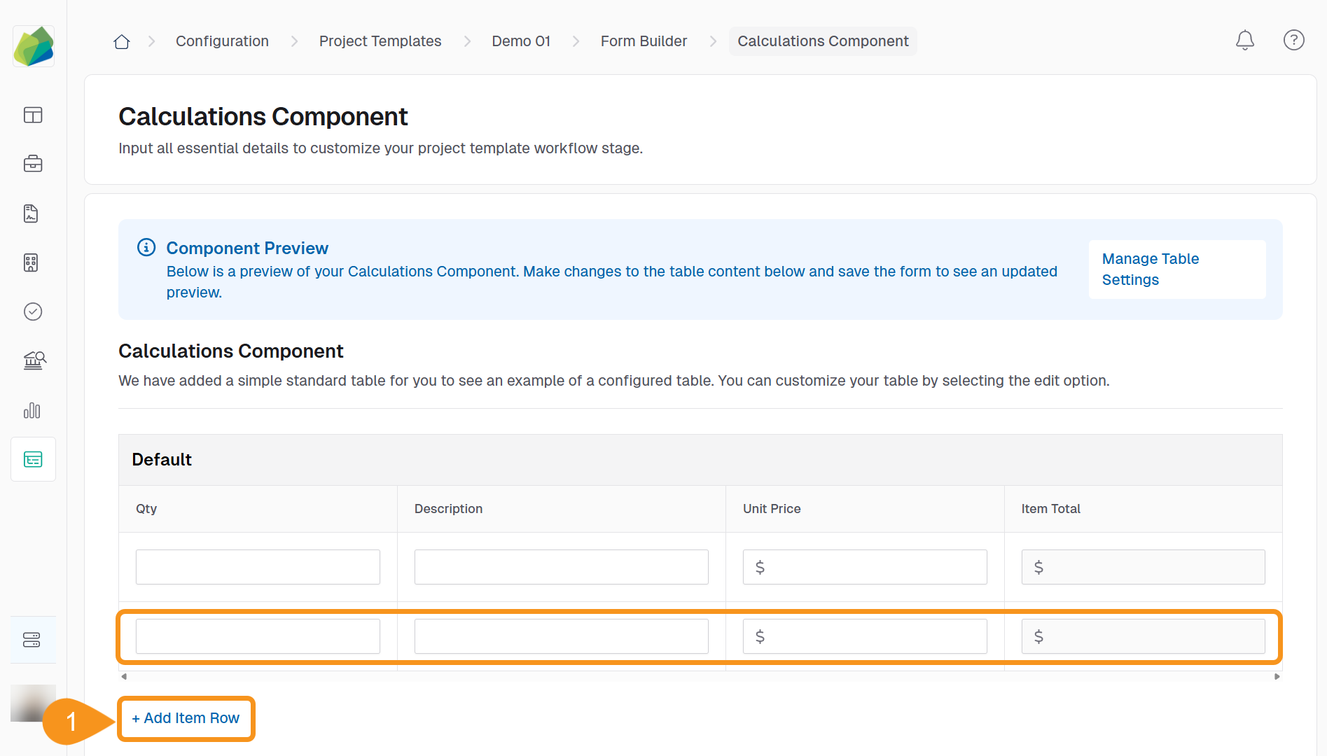 - In the Component Preview section, click + Add Item Row. New blank rows will appear in the preview table for configuration/testing purposes.