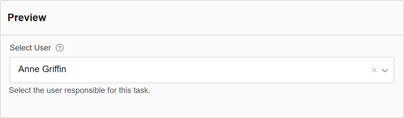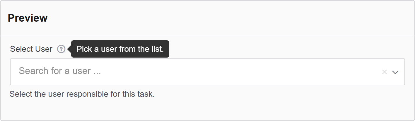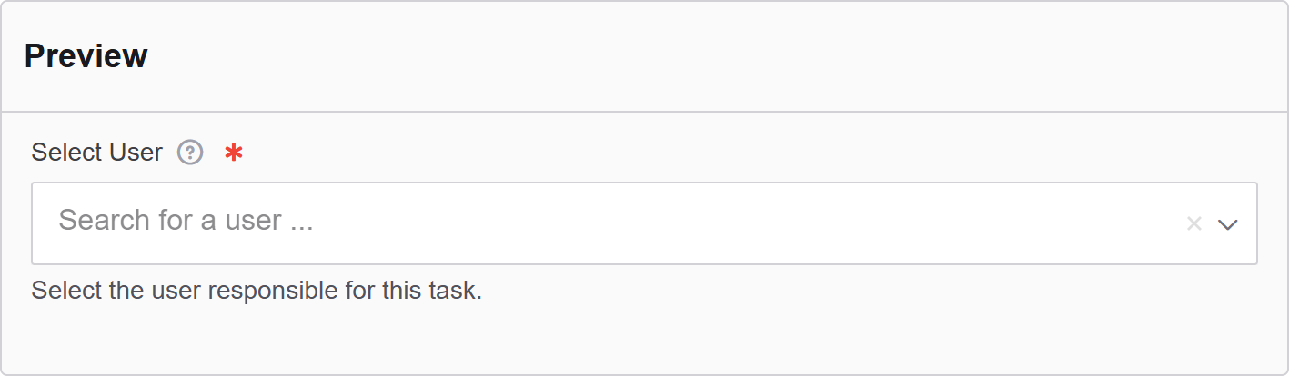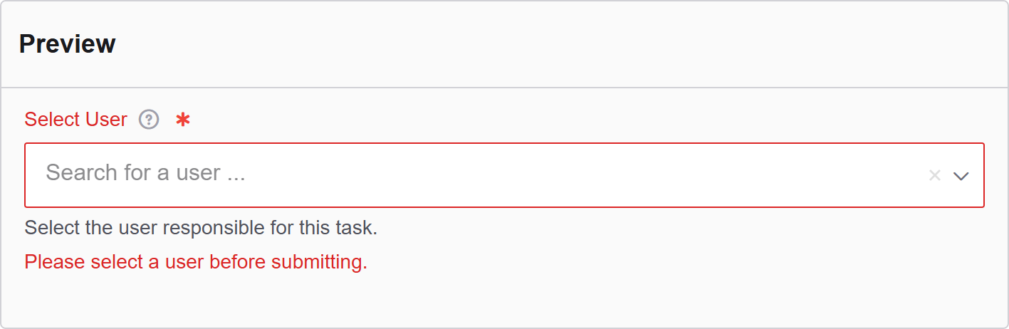 In Authorium's form builder, the User Select component is used to allow form submitters to select one or more users from your organization. This component is commonly used for assigning responsibility, designating approvers, or identifying participants in a process.