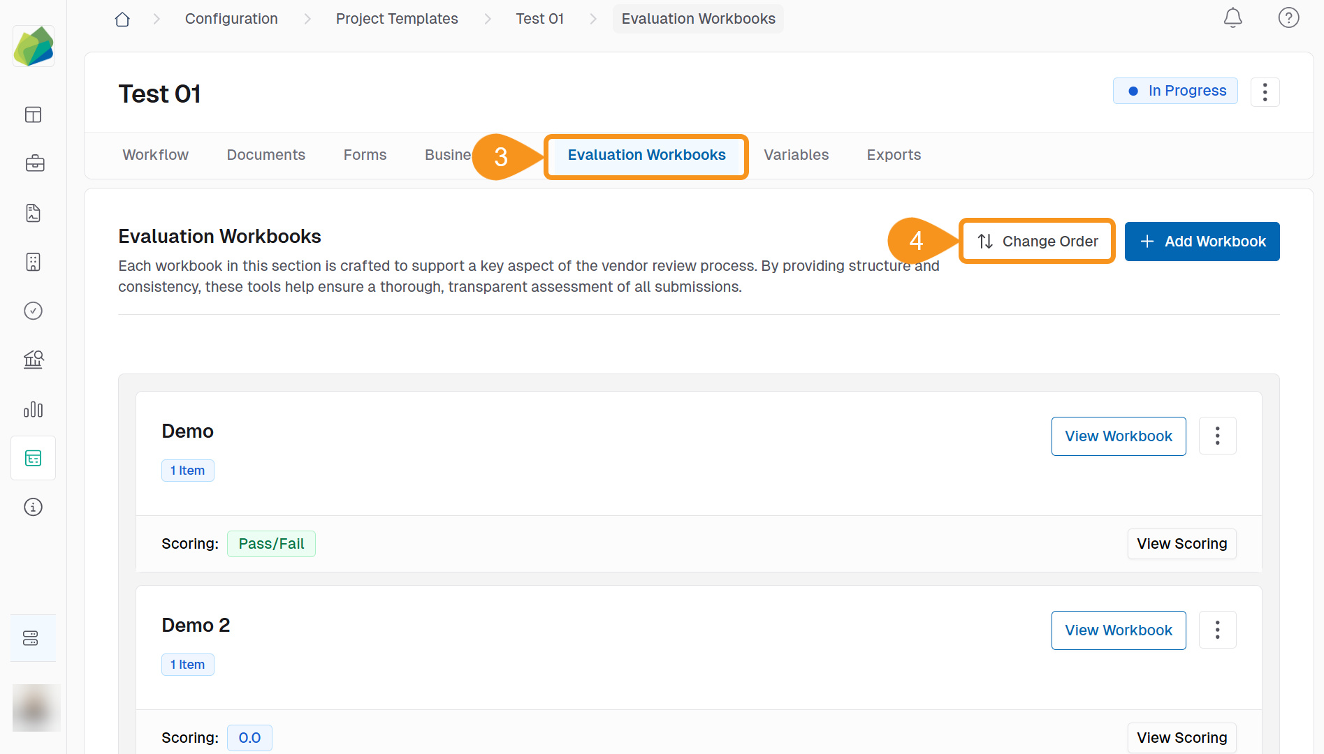 This guide explains how to change the order of Evaluation Workbooks within the Evaluations stage. Workbook order can affect how evaluators review criteria and how results are displayed.