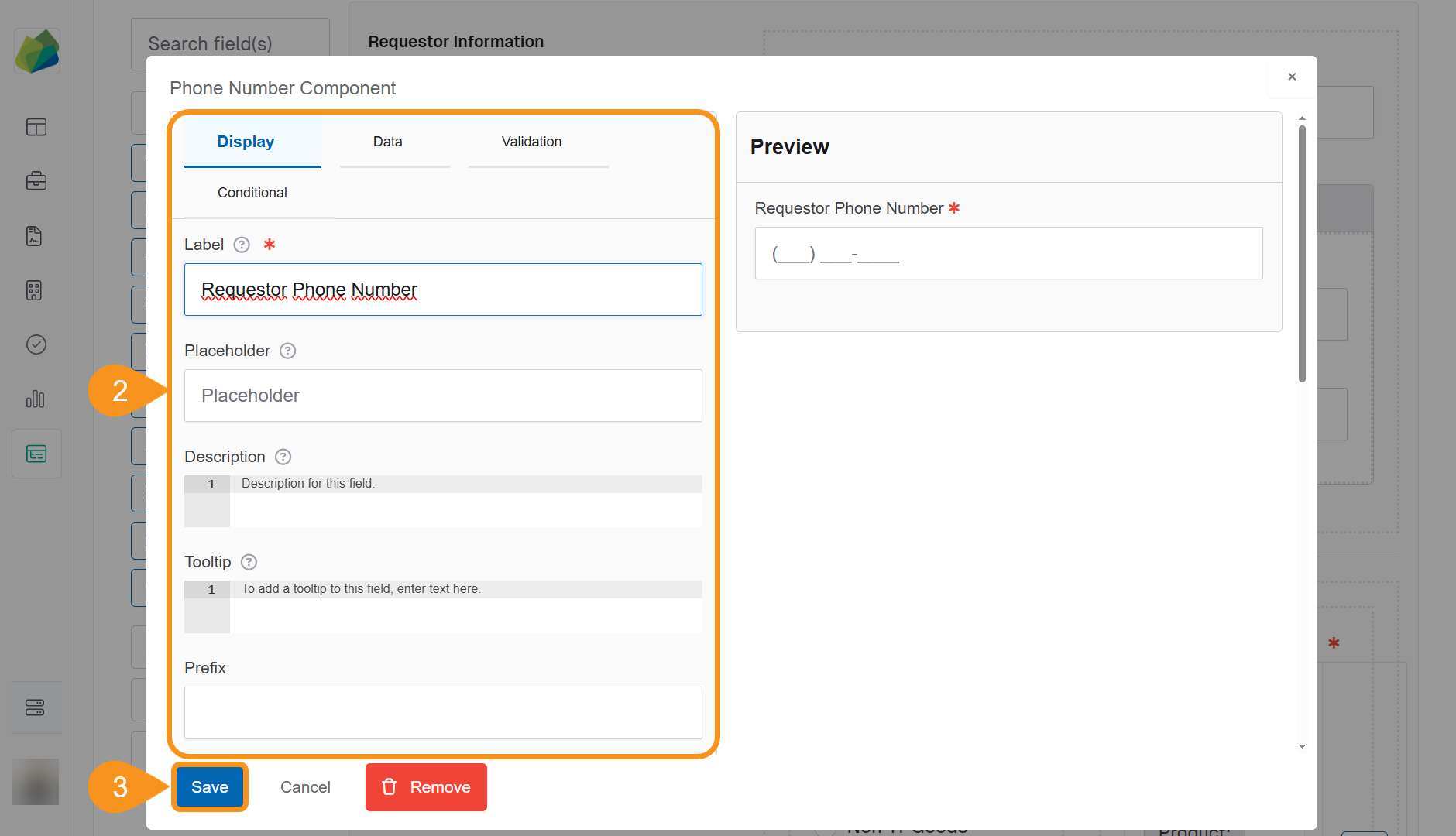 - The edit modal will appear with four tabs: Display, Data, Validation, and Conditional.