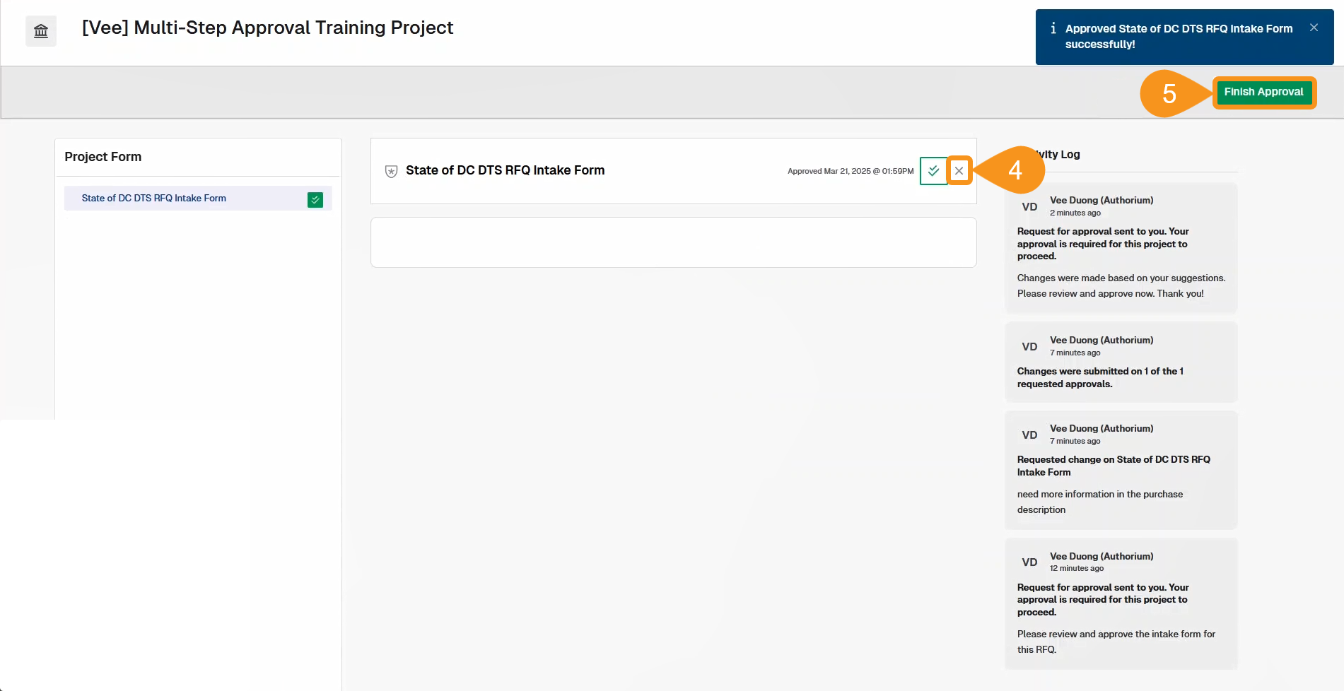 A confirmation will appear in the upper corner. The approval will also be logged in the activity section.