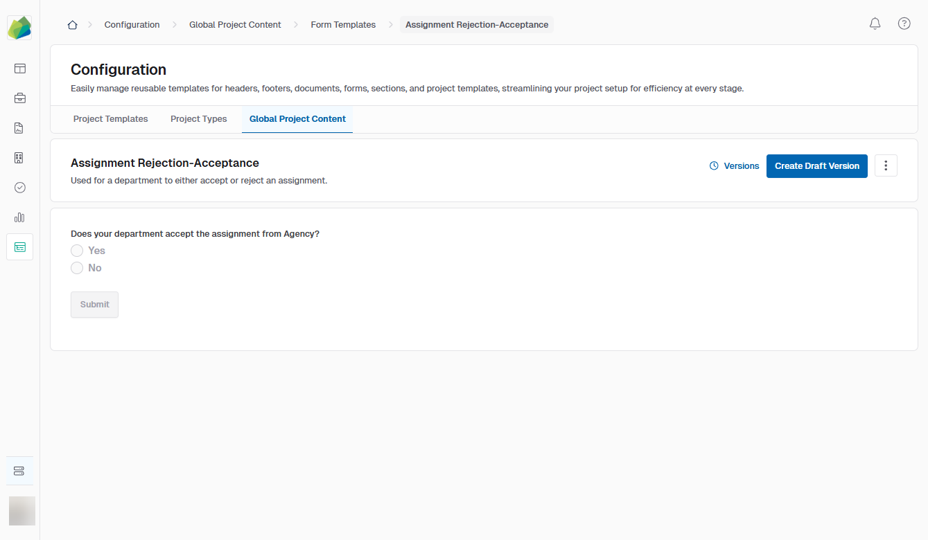 This feature enables users to create new versions of global form templates as drafts for collaborative editing. Once ready, they can publish the version immediately or schedule it for a future date. A dismissible banner notifies users of updates in affected projects.