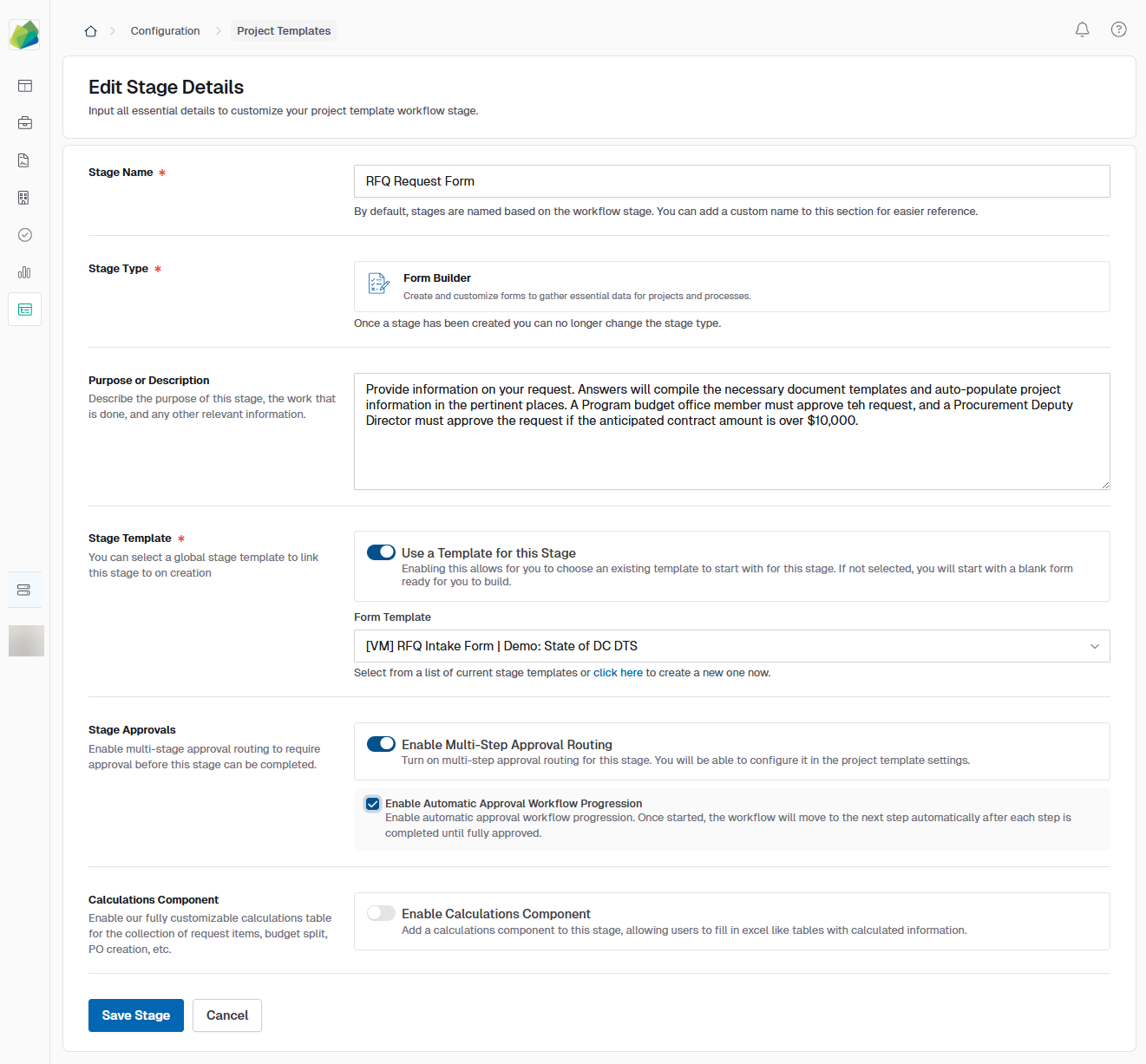 This feature enables users to configure automatic approval progression at the stage level in project template settings. When turned on, approval steps automatically progress after the previous step is completed, triggering all configured approval emails. Steps that haven't started can still be edited, while started or completed steps remain locked, ensuring proper flow control with flexibility during configuration.