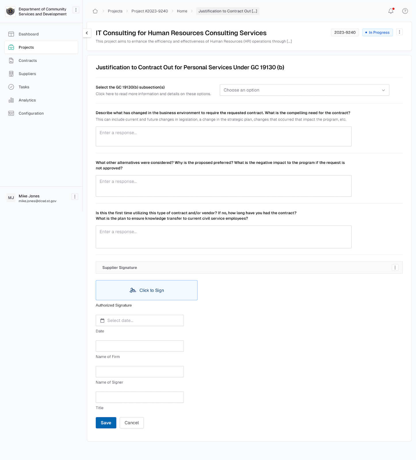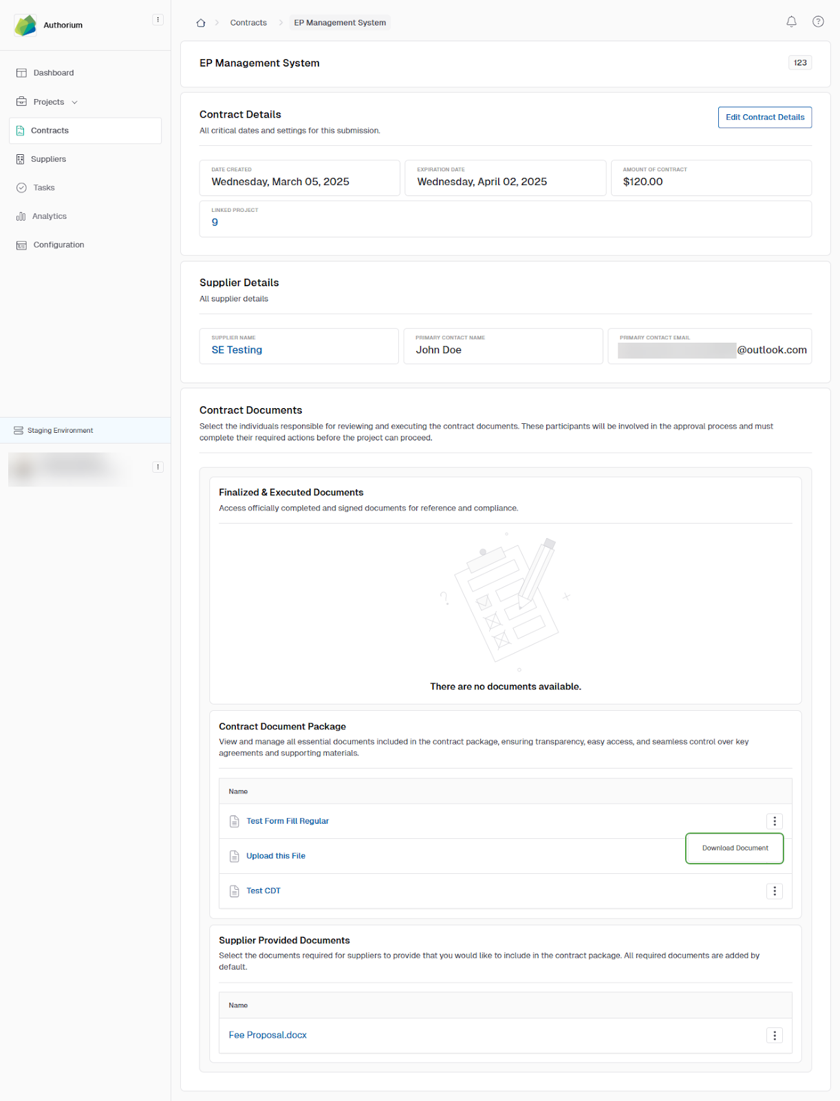 The Contract Details Page provides users with a centralized view of all critical contract information and associated documents within a project. This page displays detailed contract data such as the contract number, name, supplier information, and contract documents. Additionally, it allows users to view, download, and manage contract documents as needed, as well as viewing and editing contract details.