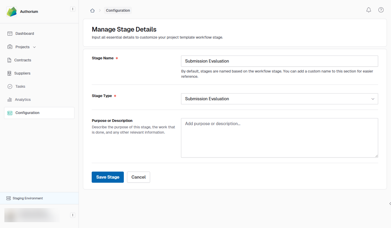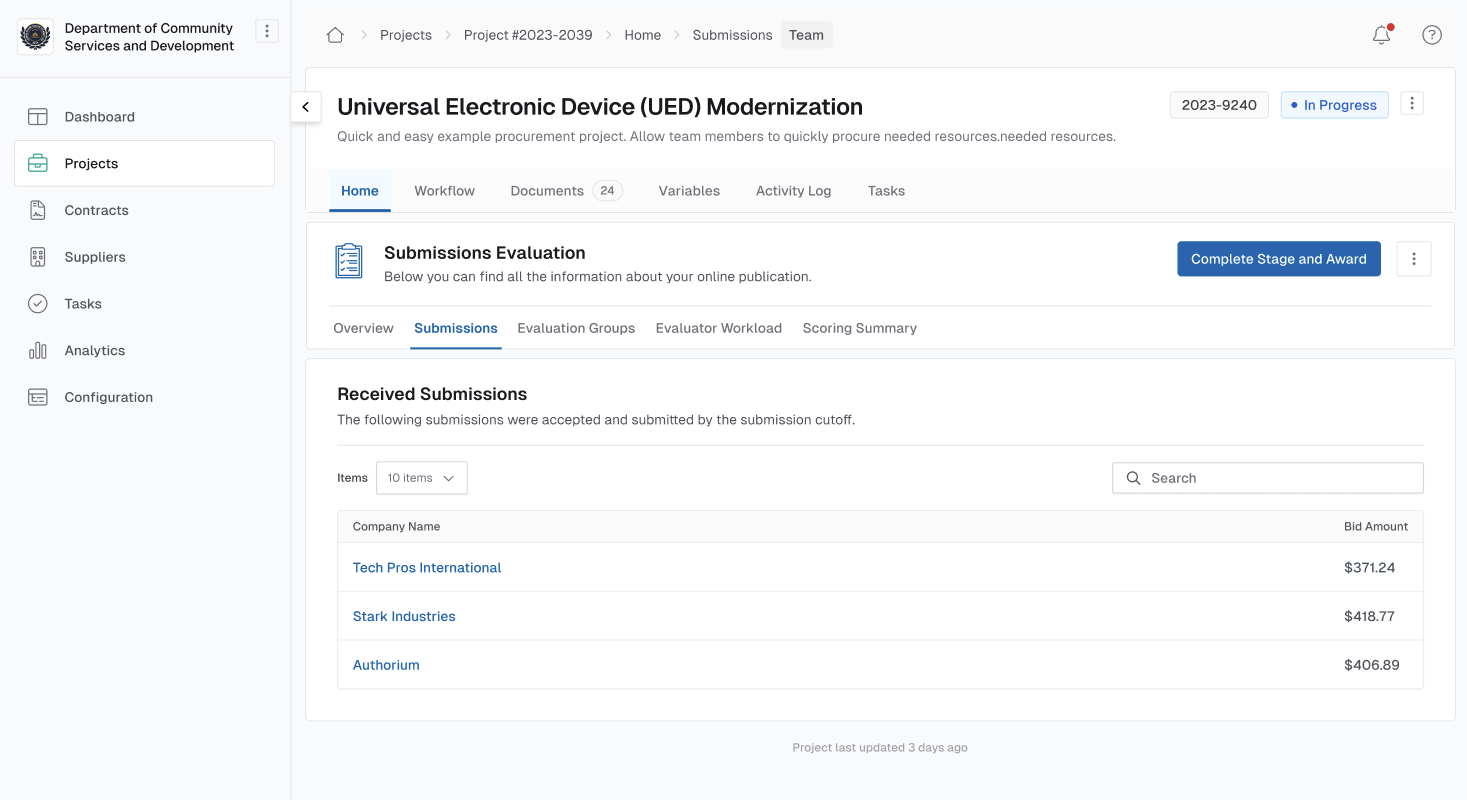 It provides a comprehensive overview of each evaluation workbook's progress, allows evaluators to be assigned to specific submissions within workbooks, and enables them to complete their evaluations. This stage also displays a scoring summary for each evaluation, culminating in the ability to award the winning supplier. Once a supplier is awarded, the project automatically progresses to the next configured stage in the workflow (e.g., contracts).