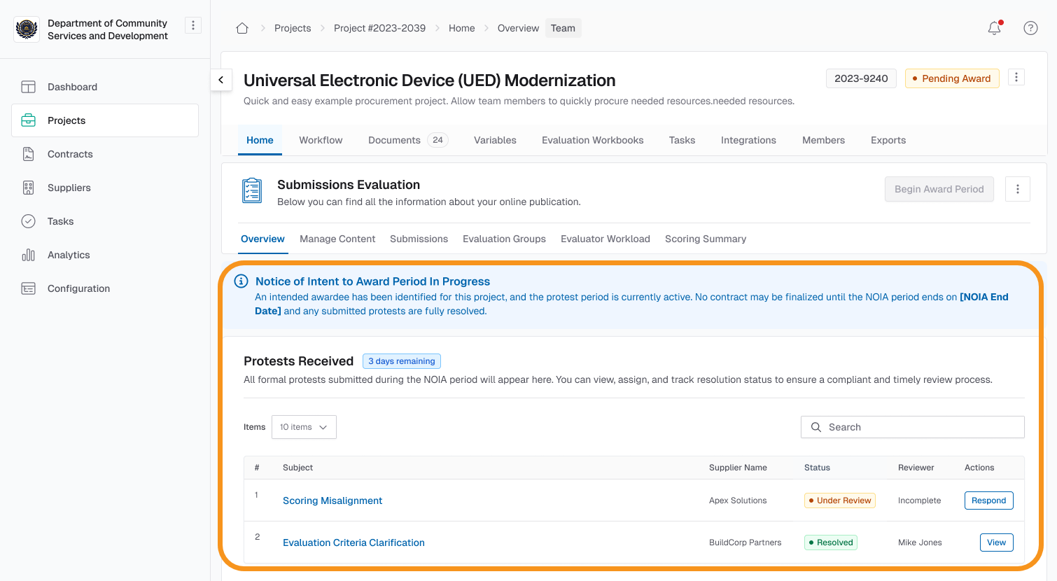 The evaluation workflow now includes a formal Notice of Intent to Award (NOIA) step, giving suppliers advance visibility into award decisions. With configurable protest period settings, automated notifications, and optional resolution tools, this update promotes transparency, supports fair competition, and provides a clear process to handle supplier feedback when applicable.